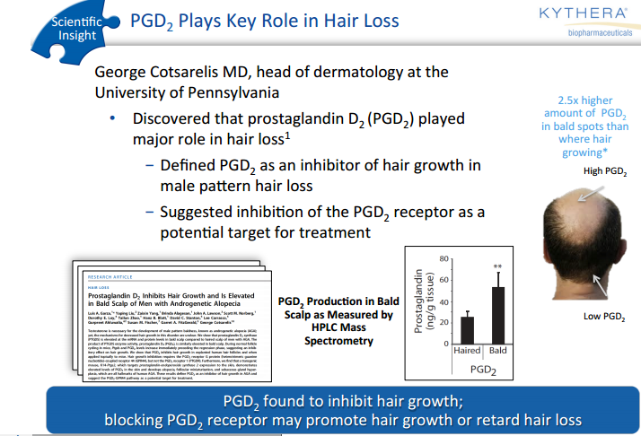Το Setipiprant δε θα γίνονταν γνωστό για την τριχόπτωση, αν δεν ανακάλυπτε ο Dr. Cotsarelis και η ομάδα του ότι οι καραφλοί άντρες έχουν υπερβολικά μεγάλη ποσότητα PGD2 στις περιοχές που δεν έχουν μαλλιά (μέχρι και 2,5 φορές παραπάνω από το κανονικό) [7]. Έτσι και η φαρμακευτική εταιρία Kythera πήρε τα δικαιώματα του φαρμάκου, ώστε να το δοκιμάσει (οι φάσεις 1&2 έχουν τελειώσει, με τη φάση 3 να είναι σε αναμονή) και να το κυκλοφορήσει στην αγορά.