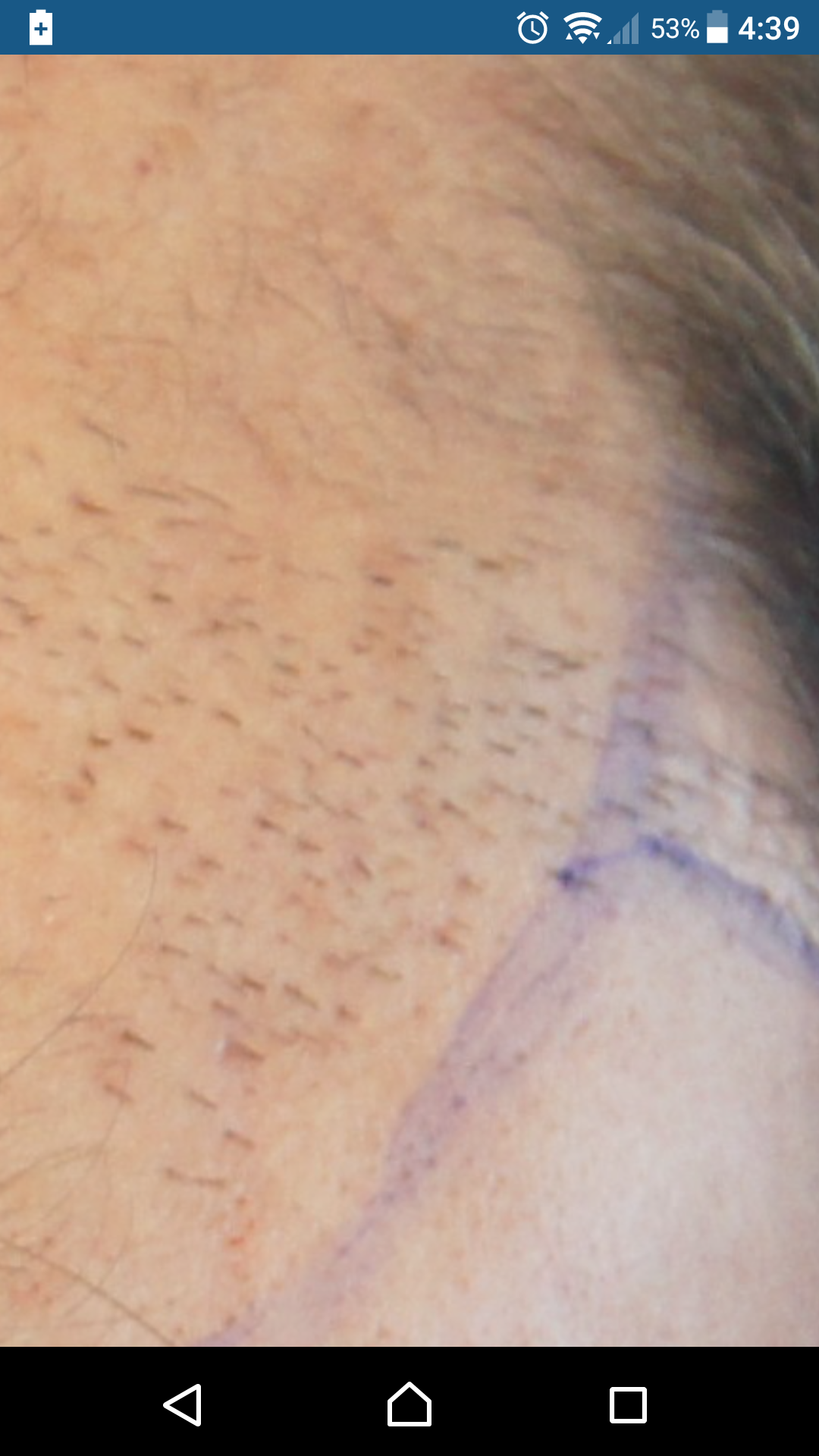Στην παρακατω φωτογραφια, στο σημειο που εστιαζω (ισως περιπου 7 cm2), υπαρχουν προγενεστερα (απο προηγουμενη μμ) περιπου 70 grafts. Με άλλα λογια υπαρχουν ηδη 10 grafts ανα cm2 πριν απο την τελευταια μεταμοσχευση.