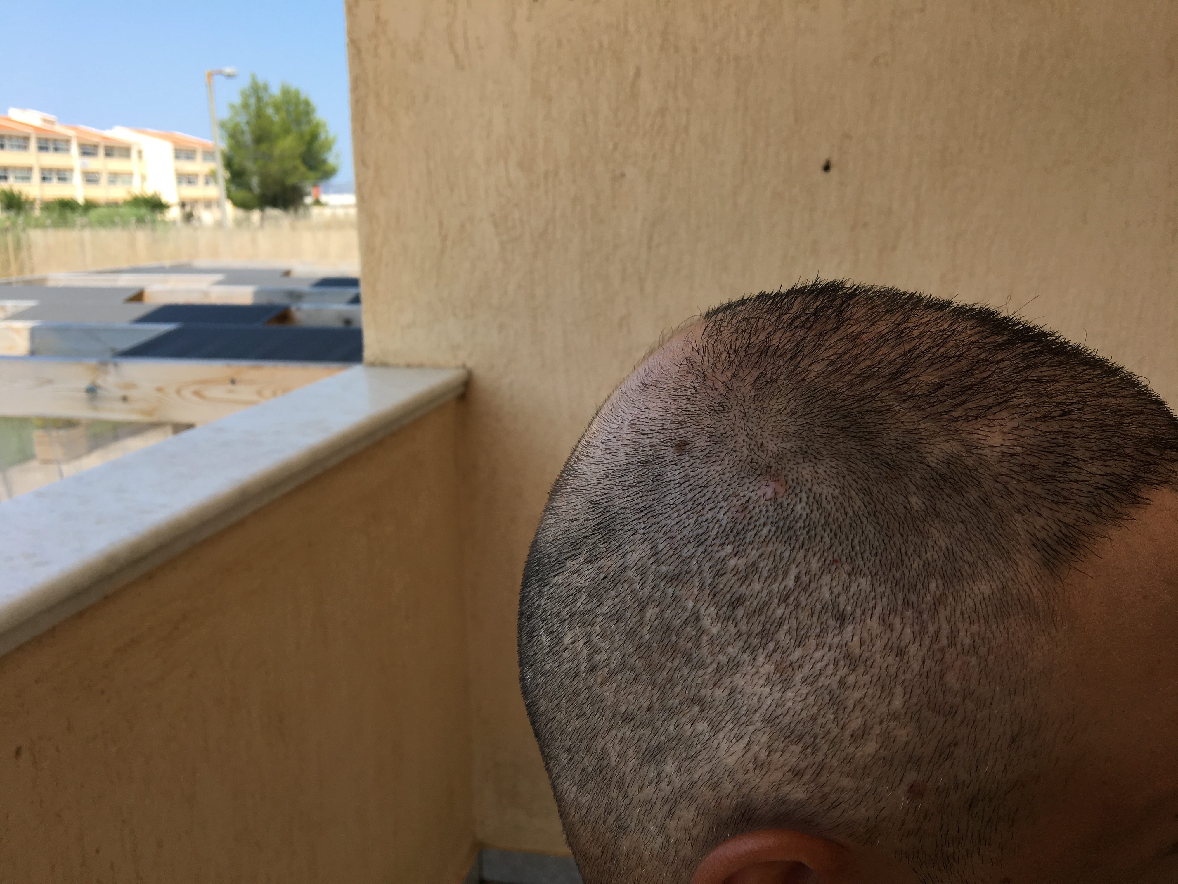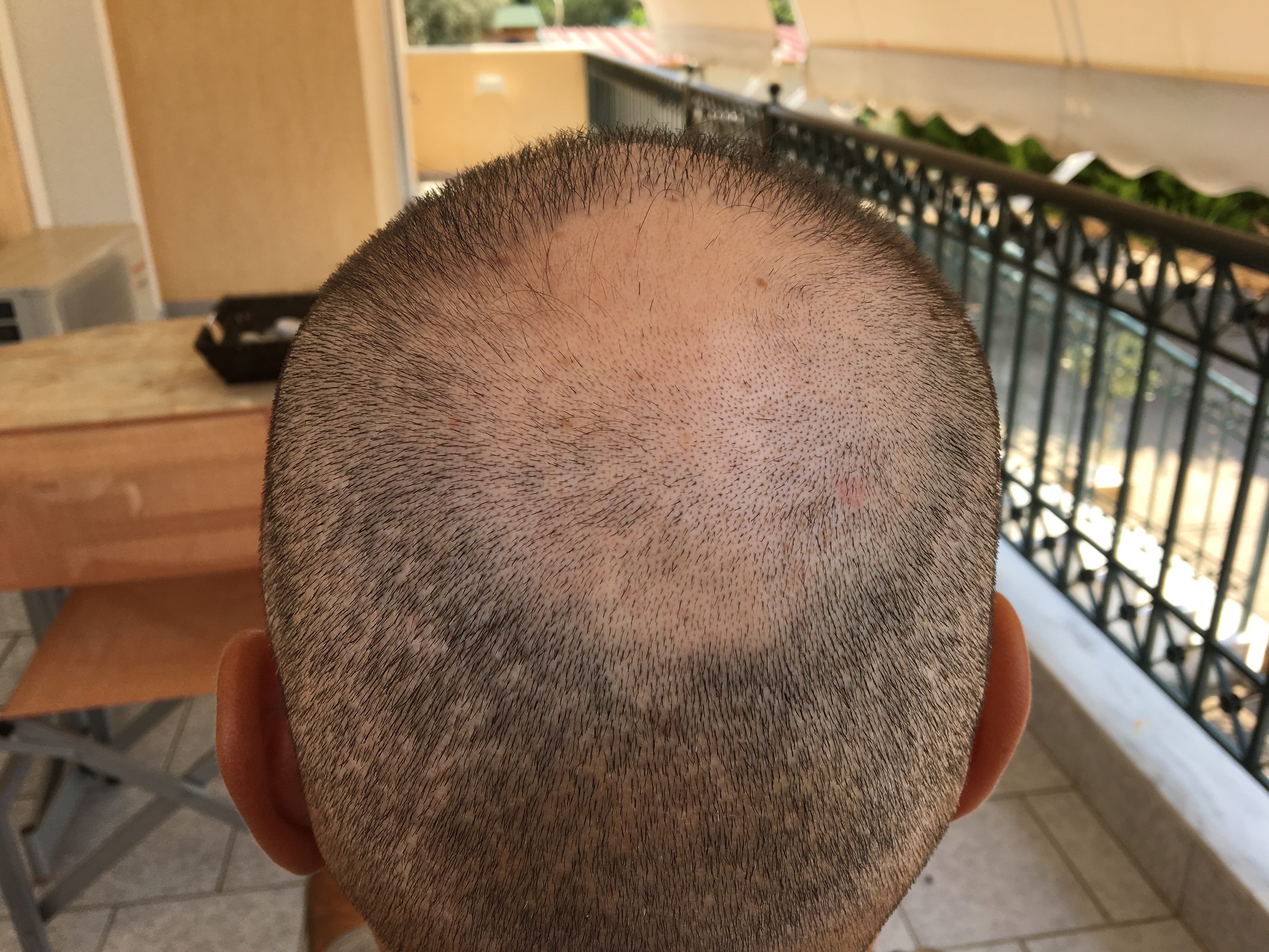 Δεν είναι μόνο white dots. Το μεγαλύτερο θέμα προέρχεται (για αυτό και φαίνεται τόσο πολύ) γιατί δεν έγινε συμμετρικό harvesting. Όταν αποψιλώσεις εντελώς μια περιοχή από graft και δίπλα της υπάρχουν άλλες χωρίς να έχεις πάρει κανένα (ή πολύ λίγα) το contrast είναι πολύ μέγαλο. Εδώ είναι κακό το patern εξαγωγής.