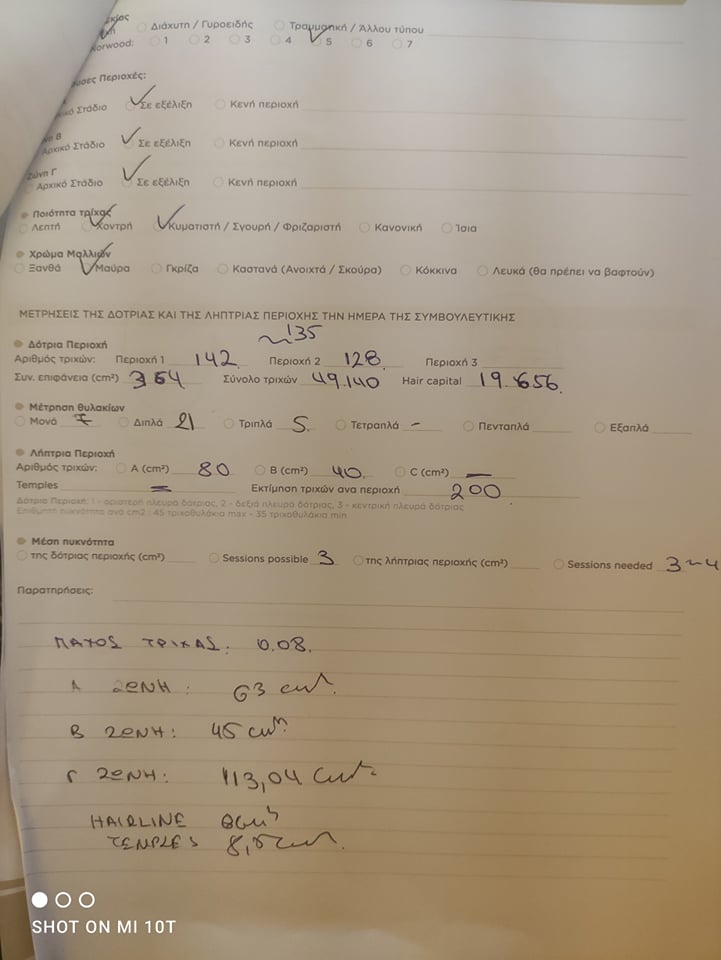 7/3 9 το πρωί ήταν προγραμματισμένο να είμαι στη κλινική όπως και έγινε , (με ατυχές συμβάν να μου έχουν πάρει τις πινακίδες λίγο πριν για παρκάρισμα, όποιος έχει σκοπό να πάει οδικός πολύ προσοχή, μακράν η χειρότερη πόλη για οδήγηση με τεράστιο πρόβλημα σε παρκινγκ) με υποδέχθηκε η νοσηλεύτρια και προχωρήσαμε σε κούρεμα της δότριας περιοχής, Μέχρι να έρθει ο γιατρός ξεναγήθηκα στο χώρο που μου φάνηκε άριστος και ένιωσα ήδη άνετα. Ακολουθούν φωτογραφίες από το κεφάλι μου πριν μπω για το κούρεμα.