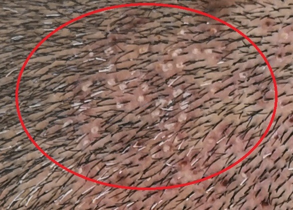 Για του λόγου το αληθές κοιτάξτε κάποια close ups από τις φώτο της δότριας στα πλάγια. Αυτά τα άσπρα σπυρακία είναι η fibrin που παράγεται κατά την επούλωση. Όταν έχει τρίχα μέσα σημαίνει ότι έχει γίνει partial transection. Αν παρατηρήσει κάποιος με ζουμ την δότρια του Πανου θα δει ότι είναι πάρα πολλά αυτά και είναι πολύ διαφορετικά από τις καθαρές εξαγωγές που είναι μια κόκκινη άδεια τρύπα.