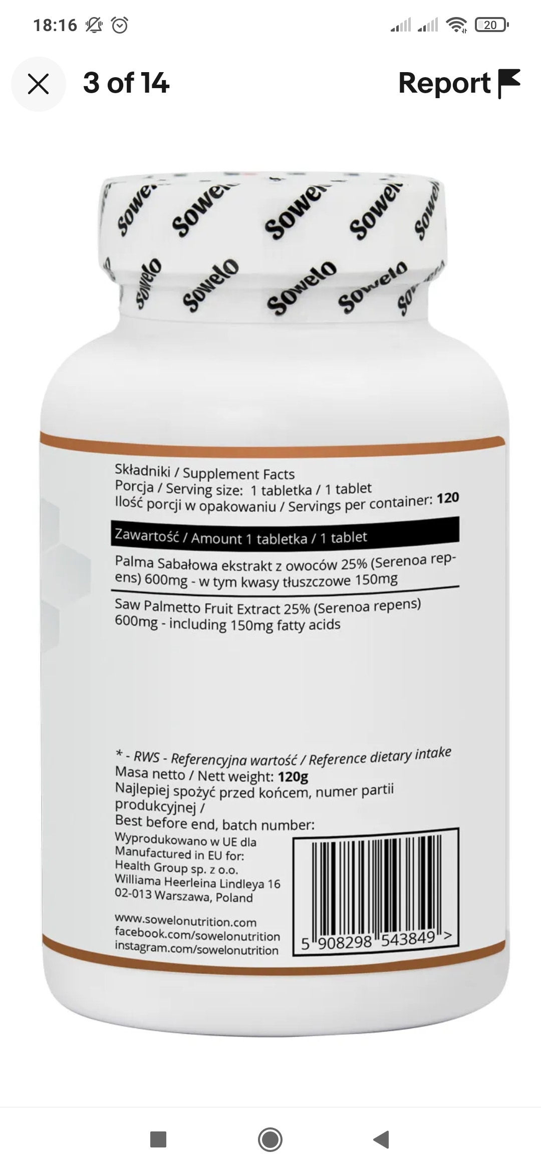 ναι πρέπει να έχει 85-95% fatty acids με δοση 320mg σε softgel αυτό που θα πάρεις..δηλαδή όπως αυτό που σου έστειλα της now foods...ή αυτό από κάτω αλλα ειναι πιο ακριβοΠάντως οι βιταμίνες του γιαμαν έχουν και sawpalmetto μέσα 150 mg / κάψουλα και μου είχε πει μια ή δυο να πίνω, αφού το επιβεβαίωσα ξανά πήρα 1 κάθε μέρα έως και σήμερα, άρα 150 mg, αλλά είχε και άλλα μέσα που ίσως βοήθησαν, πριν μου έλεγε ότι χρειάζεται 340-360 την μέρα όσο αναφορά το saw palmetto.. Τώρα δε ξέρω τι να πω, λίγο πίνω τόσο καιρό μάλλον, και τα whole Berry λογικά δουλεύουν απλά θέλουν μεγαλύτερη δοσολογία, άρα δεν συμφέρει, εγώ θέλω να πίνω ένα χάπι ένα τρίμηνο, άρα μάλλον θα ακούσω την σύμβουλη σου, το πρώτο που έβαλα αν δεις γράφει ένα χάπι 540 mg δοσολογία την μέρα αλλά δεν έχει τα ποσοστά όπως αυτο που προτείνεις..
