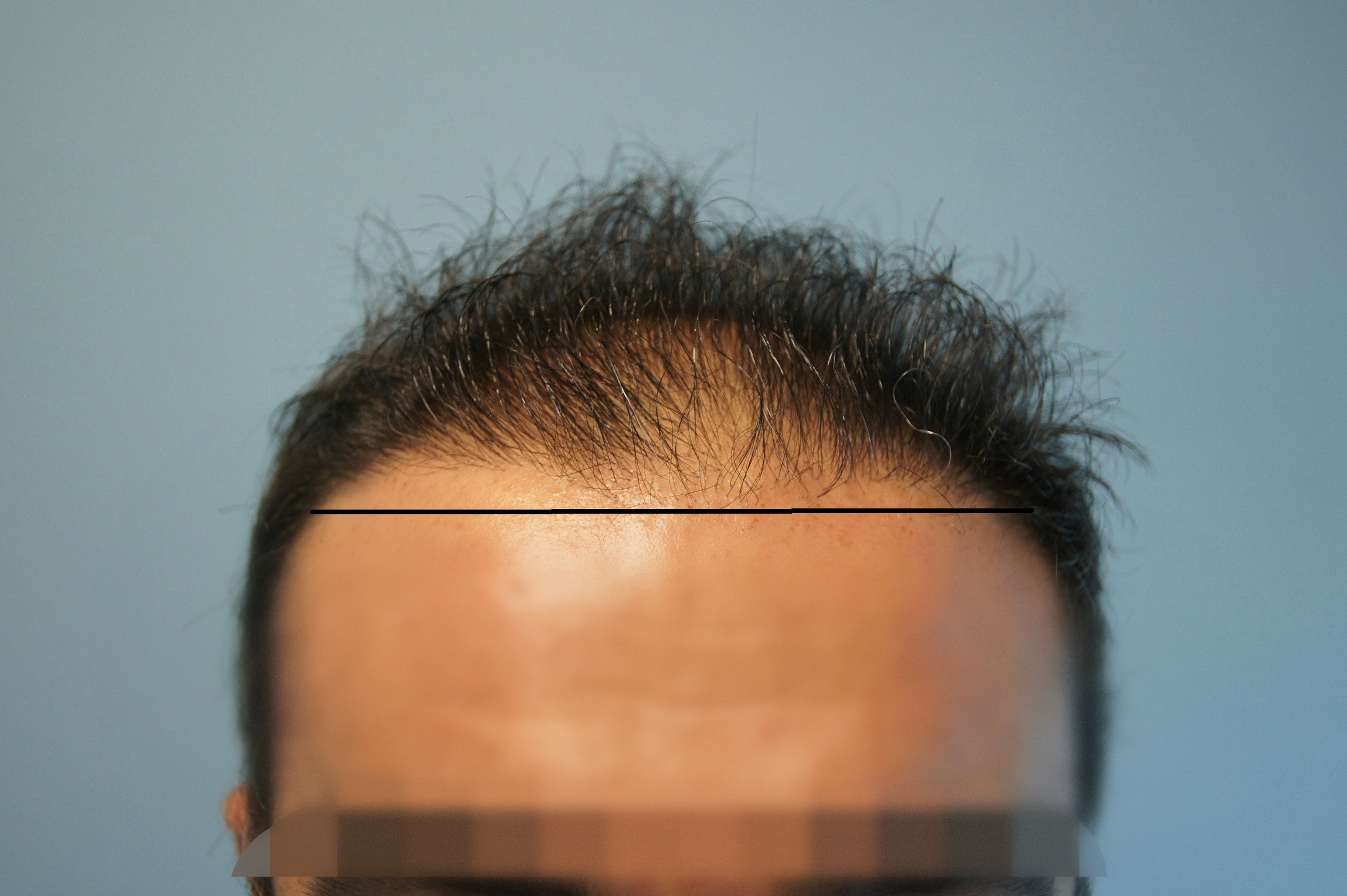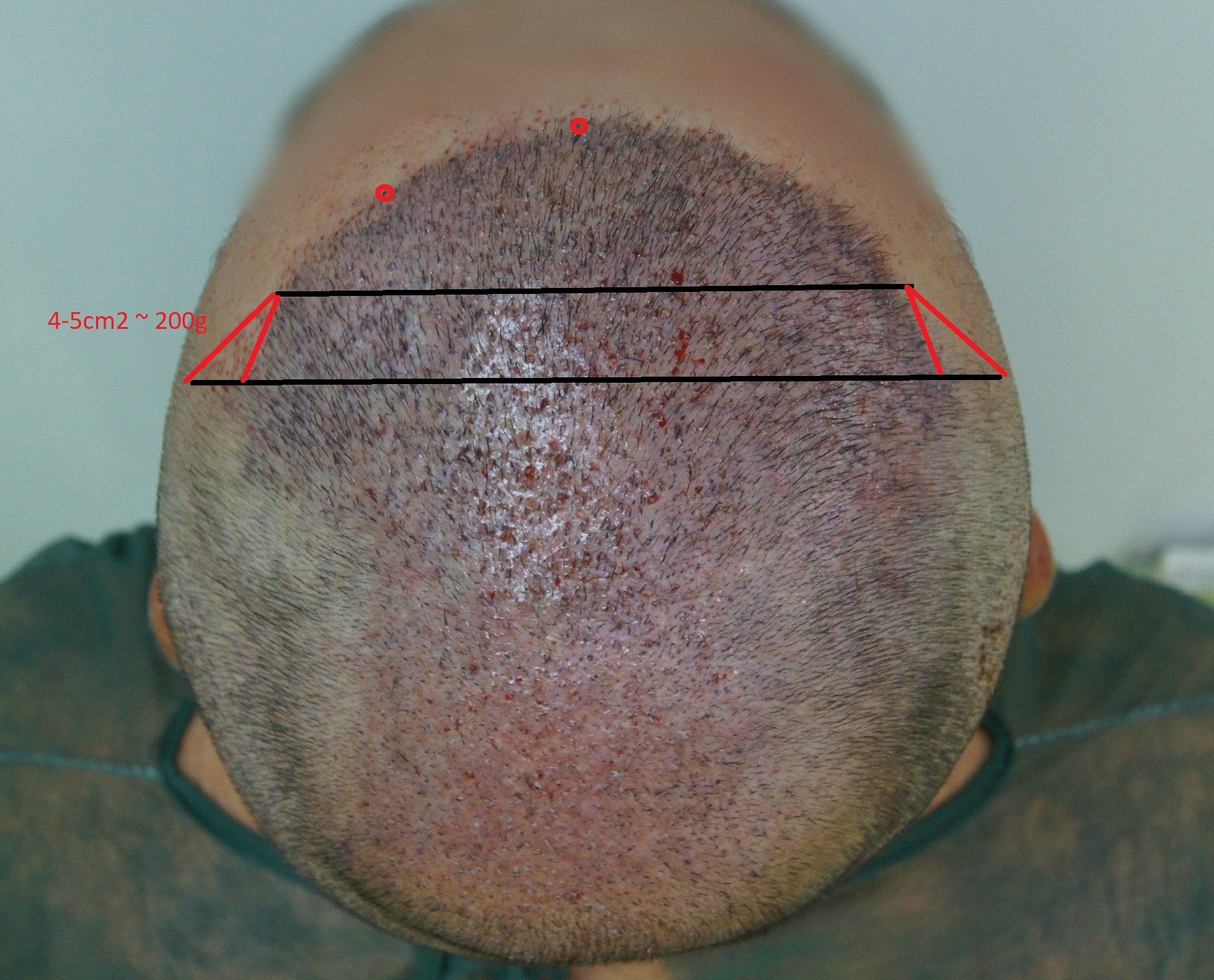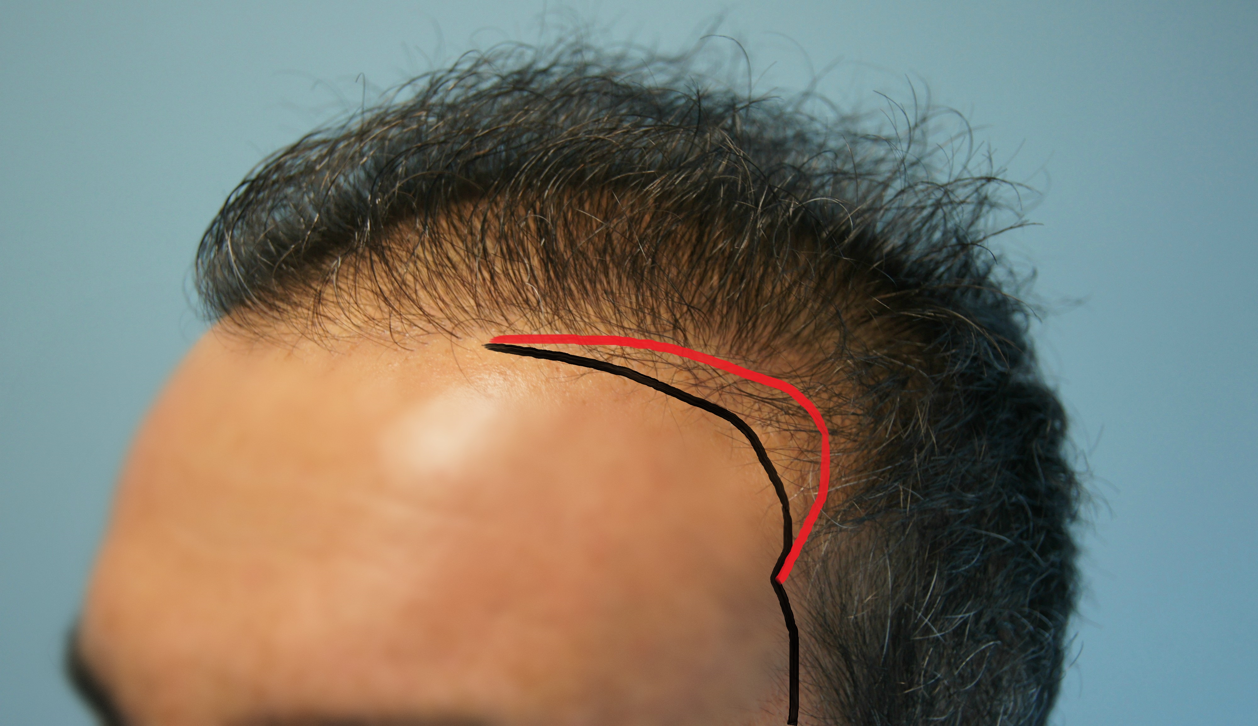 Με δεδομένο ότι η συμμετρία (αλλά όχι η απόλυτη) είναι το ζητούμενο αισθητικά, υπήρχαν 2 επιλογές Ή να κλείσουν και οι 2 κροτάφοι στο πρότυπο του αριστερού, ή να γίνει αυτό που έγινε. Και οι 2 ενέργειες είναι σωστές ανάλογα με την περίπτωση του ασθενούς και την ηλικία. Εδώ μιλάμε για repair case όπου πλέον έχεις αρχίσει και το BHT και είναι μικρός σε ηλικία. Άρα πρέπει να πας σαφώς με την συντηρητική επιλογή τουτέστιν αυτό που έγινε. Αν ήθελες να κάνεις την 1η επιλογή θα σου στοίχιζε περίπου άλλα 140g η αριστερή και άλλα 200g η δεξιά χωρίς να υπολογίσουμε τι θα γινόταν σε περίπτωση που η φύτρωση δεν θα ήταν άριστη ή χάσεις τις μαμα. Έπρεπε να έχεις δηλαδή ένα περίσσευμα περίπου 500g για να είσαι καλυμμένος 100%. Είναι προφανές ότι τέτοια πολυτέλεια δεν υπάρχει εδώ. Οι τρίχες που ήταν κοντά στην οριοθετημένη hairline θα μπορούσαν να μην αφαιρεθούν (κόκκινοι κύκλοι) αφού αυτά τα φυσικά sentinel hairs προσφέρουν στην φυσικότητα. Αυτό όμως είναι μια λεπτομέρεια, δεν είναι η ουσία. Το επισημαίνω όμως για να γνωρίζουμε την σημασία των sentinel hair στην φυσικότητα της hairline.