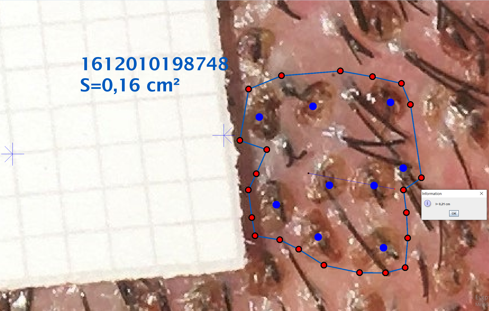 Και επειδή η θεωρία πρέπει να επιβεβαιώνει και το πείραμα (παρατήρηση) ιδού η απόδειξη. Πήρα μια παλιά φώτο δικιά μου από την τοποθέτηση στην 2η επέμβασή μου. Επειδή είχα βάλει πάνω κλίμακα, μπορώ πλέον να κάνω ακριβέστατες μετρήσεις. Τι μας δείχνει? Το pen που χρησιμοποιήθηκε είναι 1.0mm (για τα δίτριχα μου) αφού έχω χοντρή τρίχα περίπου 60μ. Επιβεβαιώνεται και από το σχήμα. Αφού μετράω 2 κολλητά graft (λεπτή μπλε γραμμή) στα 0.21cm, δηλαδή 21mm/2=1.05mm! Με λίγα λόγια ο Λορένζο θα μπορούσε να συνεχίσει στο ίδιο μοτίβο και να βάλει άνετα 4 ζευγάρια x 21mm = 84mm<100mm, δηλαδή 64g για πλάκα και με λίγο ζόρι κοντά στα 70g (σε κενή περιοχή). Η συγκεκριμένη περιοχή του σχήματος που έχω μαρκάρει αφορά 0,16cm2 έχει και 5 μαμίσια και η πυκνότητα των νέων graft είναι 9/0,18 (0,16+10% διόρθωση λόγω κλίσης)~50g.